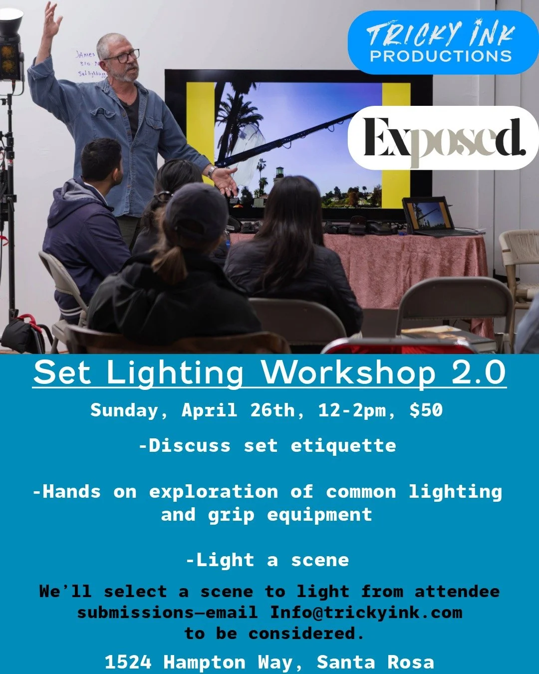 Join us for the next Lighting workshop! Hosted once again by James Frederick, and Sean Carroll joining at Exposed Studios.